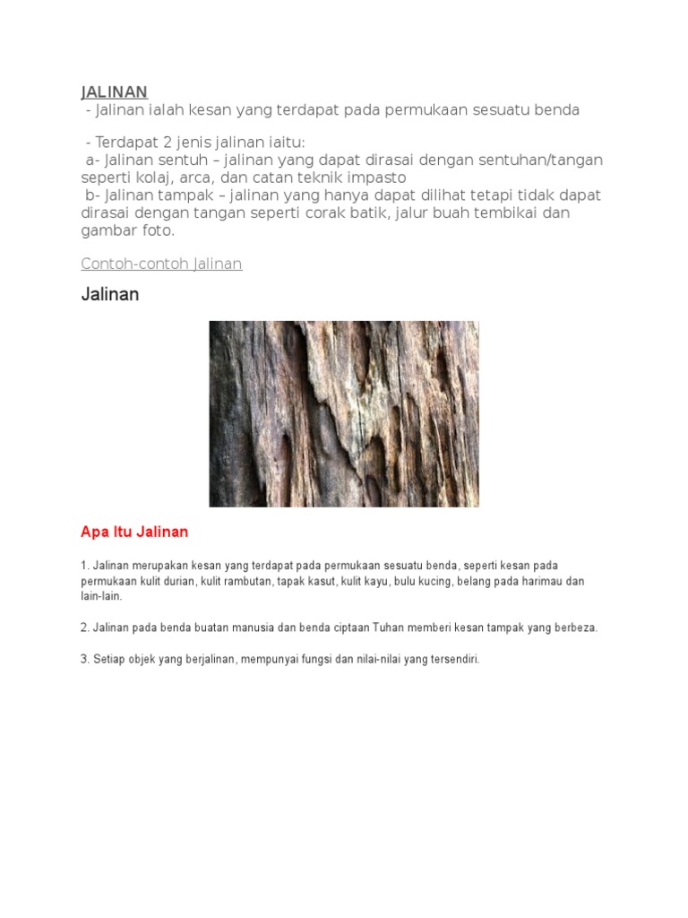 Jalinan merupakan kesan atau sifat yang terdapat pada seusatu permukaan. Merupakan kesan permukaan yang dapat dilihat dan dirasa melalui sentuhan. Jalinan sentuh boleh Rajah 51 Contoh-contoh jalinan pada alam semula jadi dilihat dan dirasa Jalinan pada objek buatan manusia secara sentuhan bersifat licin lembut kasar dan.